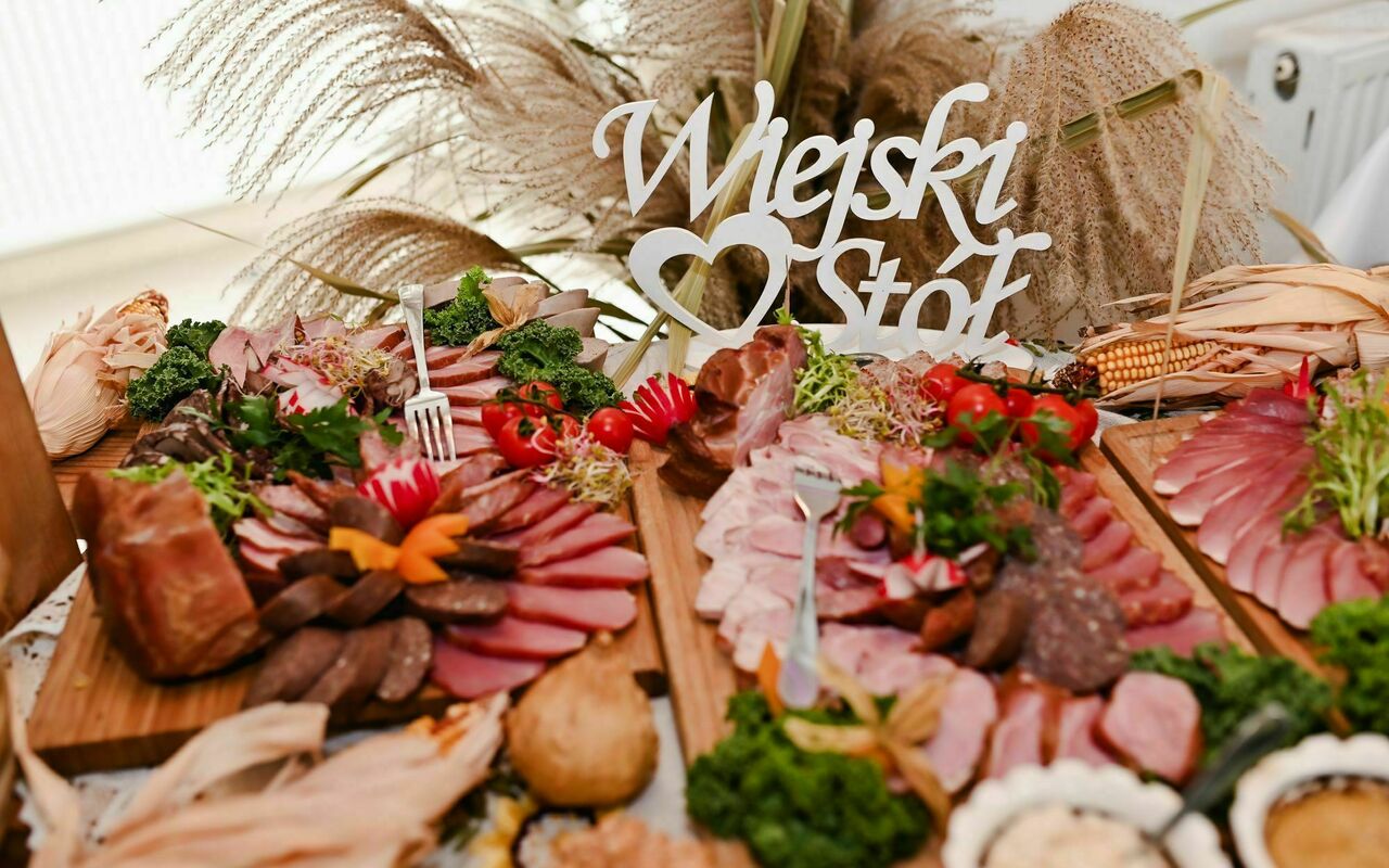 Szynka z własnej wędzarni, kiełbasy wiejskie z własnej wędzarni, karczek zbójnicki z własnej wędzarni, kabanosy z wędzarni, polędwica z wędzarni, krupnioki, pasztet chłopski, twaróg gospodarski, ogórki kiszone, smalec swojski, kosze z pieczywem, chrzan, musztarda. Koszt do 50 osób.